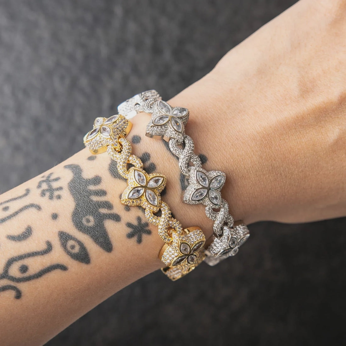 Each link is fully iced with hand-set zirconia stones to give a strong, city-night shine while staying comfortable for everyday wear.